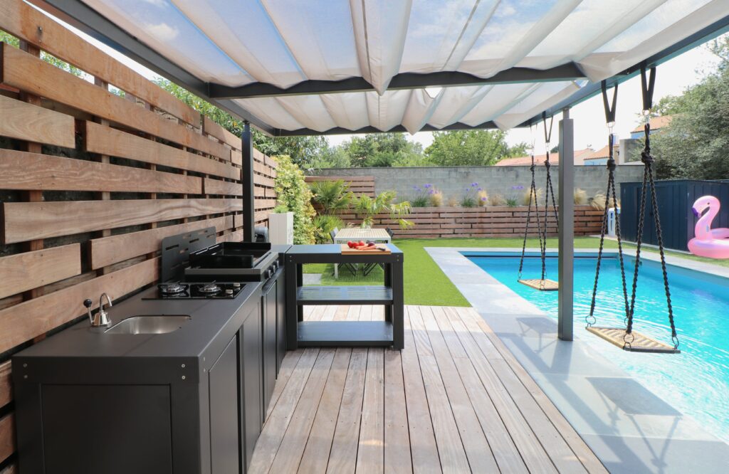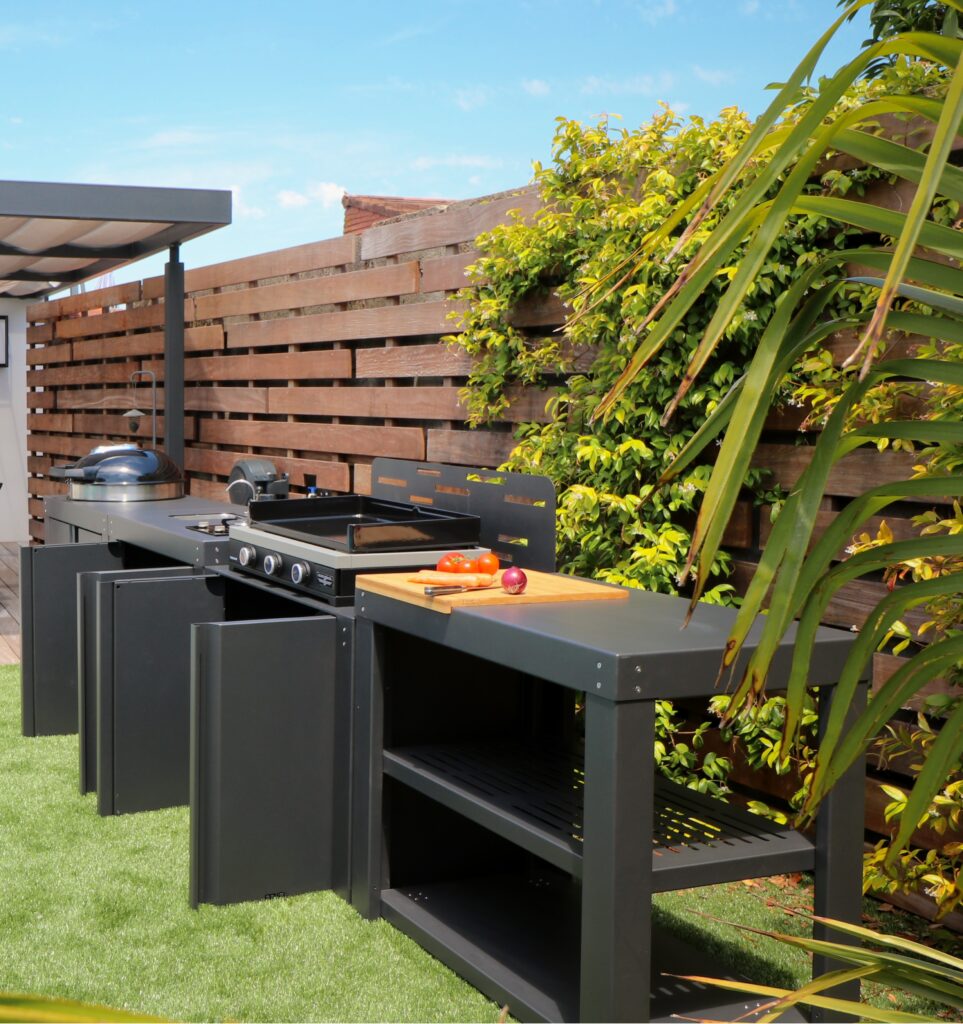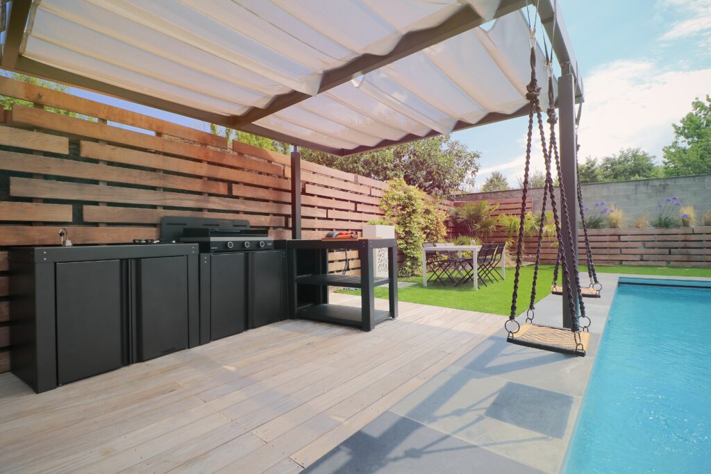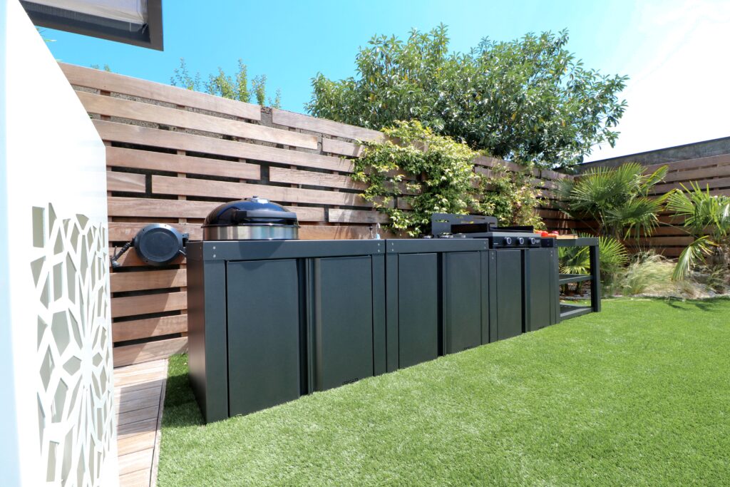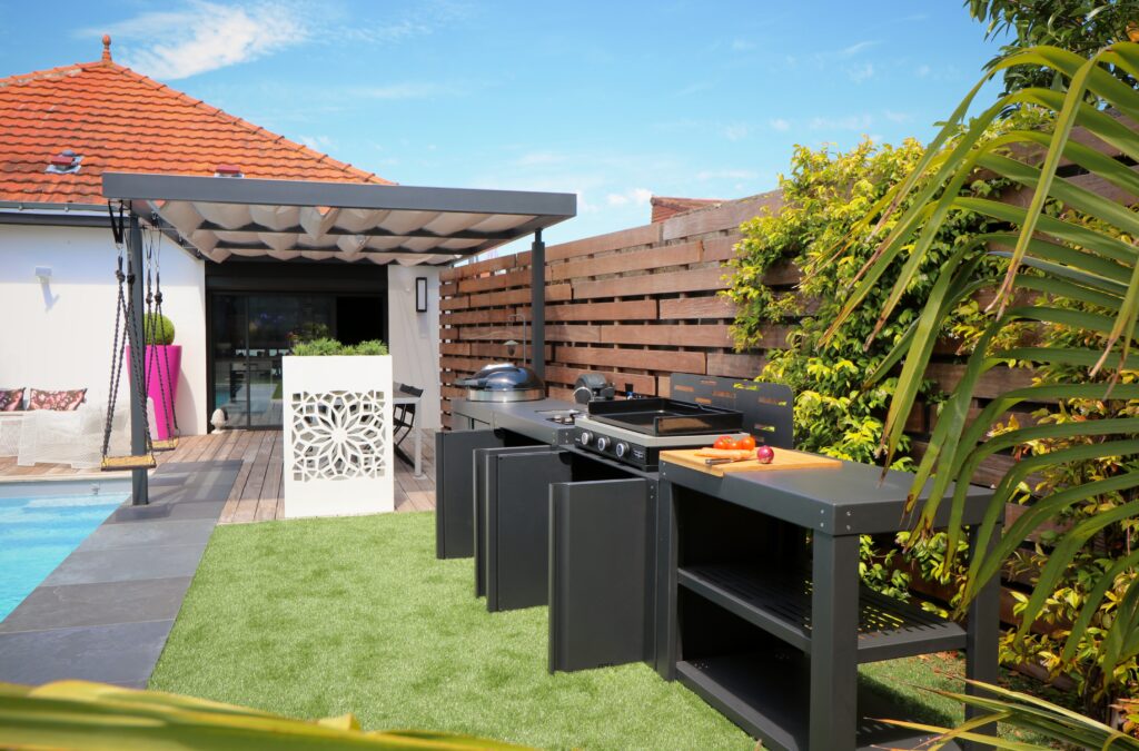 Cette modularité permet d’adapter votre espace de vie extérieur à chaque saison ou événement : repas d’été, apéritifs entre amis, cuisine en plein air ou moments en famille.